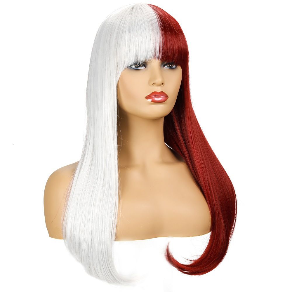 Unisex Two Tone Half Red White Long Straight Hair Wig