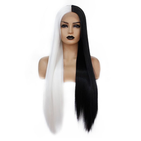 Halloween Half White Half Black Long Straight Lace Front Wig