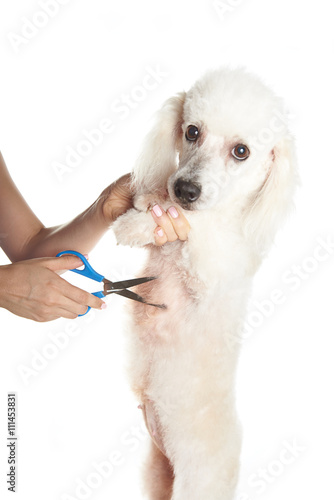 French Poodle Dog Getting A Hair Cut On White Background Stock